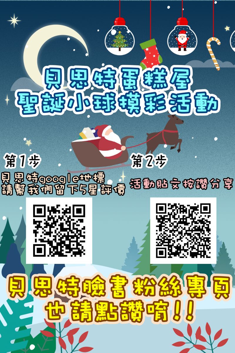 即日起至109/12/31,凡購買生日蛋糕或小蛋糕系列達1000元,並於貝思特臉書fb按讚+粉絲頁置頂的活動文分享+google地標5星評論,即可參加聖誕彩球抽獎活動喔!!
